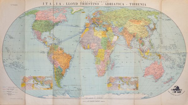 Stampa a colori, cm 67x136, pieghe editoriali, qualche strappetto restaurato e piccoli difetti alle pieghe. Grande planisfero disegnato da L. Visintin con le rotte marittime delle compagnie Italia, Lloydt triestino, Adriatica, Tirrenia.