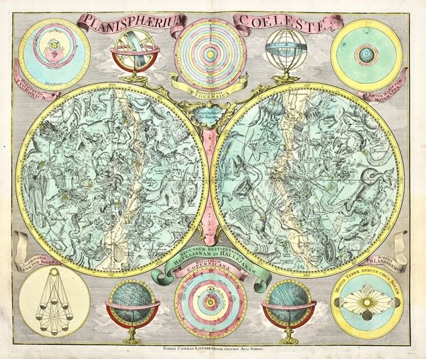 Incisione in rame, colorata d'epoca, mm 480x575. Bellissimo planisfero celeste arricchito da numerosi particolari che descrivono le varie ipotesi astronomiche, i moti della terra, sfere armillari e globi. Da "Atlas novus" o "Grosser Atlas". Splendido esemplare in bellissima coloritura originale.<BR>Lotter proseguì nell'attività di Seutter utilizzando spesso le medesime lastre con minime variazioni, ma pubblicando anche materiale inedito spesso assai decorativo e a volte raro. Le sue carte hanno sempre colori brillanti e cartigli elaborati come quelle di Seutter, che dopo un apprendistato presso Homann a Norimberga, trasferitosi ad Augsburg verso il 1720, aprì la propria attività superando il maestro sotto il profilo della bellezza. Warner; The Sky Explored, p.164<BR>Copperplate, original colour, mm 480x575. A very decorative double hemisphere celestial chart, centred on poles, decorated with smaller circular diagrams illustrating astronomical theories (Tycho, Ptolemy, Landsbergen, Copernicus), armillary spheres, terrestrial globes and other. A superb example.<BR>Very good condition in brilliant original colour. Lotter run then the business using mostly Seutter's plates but adding some new ones also. Seutter, after having worked with Homann in Nuremberg, opened his own activity in Augsburg around 1720. His maps always have elaborate cartouches and are very decorative and printed on good paper. Lotter married Seutter's daughter in 1740 and succeeded him in 1756. Warner; The Sky Explored, p.164<BR>