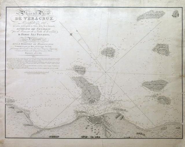 Plano del Puerto de Vera Cruz. Levantado en 1807 de orden del Capitan de Navio de la Real Armada D. Cirlaco De Cevallos por el Teniente de Navio de la misma D. Fabio Ali Ponzoni. Pubblicado en la Direccion de Hidrografia y presentado al Rey Nuestro Senor por mano de Exmo. Sor. D. José Vasquez Figueroa Secretario de Estado y del Despacho Oniversal de Marina.