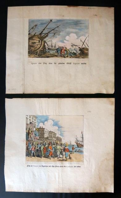 1750 circa. Coppia di incisioni all’acquaforte, vecchia ma non coeva coloritura, cm 30 x 37; 32 x 37 circa (i fogli). Scene di soggetto popolare con figure curiose e grottesche alla maniera dell’artista germanico Kusell (Augusta, 1626 – Augusta, 1684). Carta lievemente ingiallita ma esemplari in margini e in piacevole coloritura. .