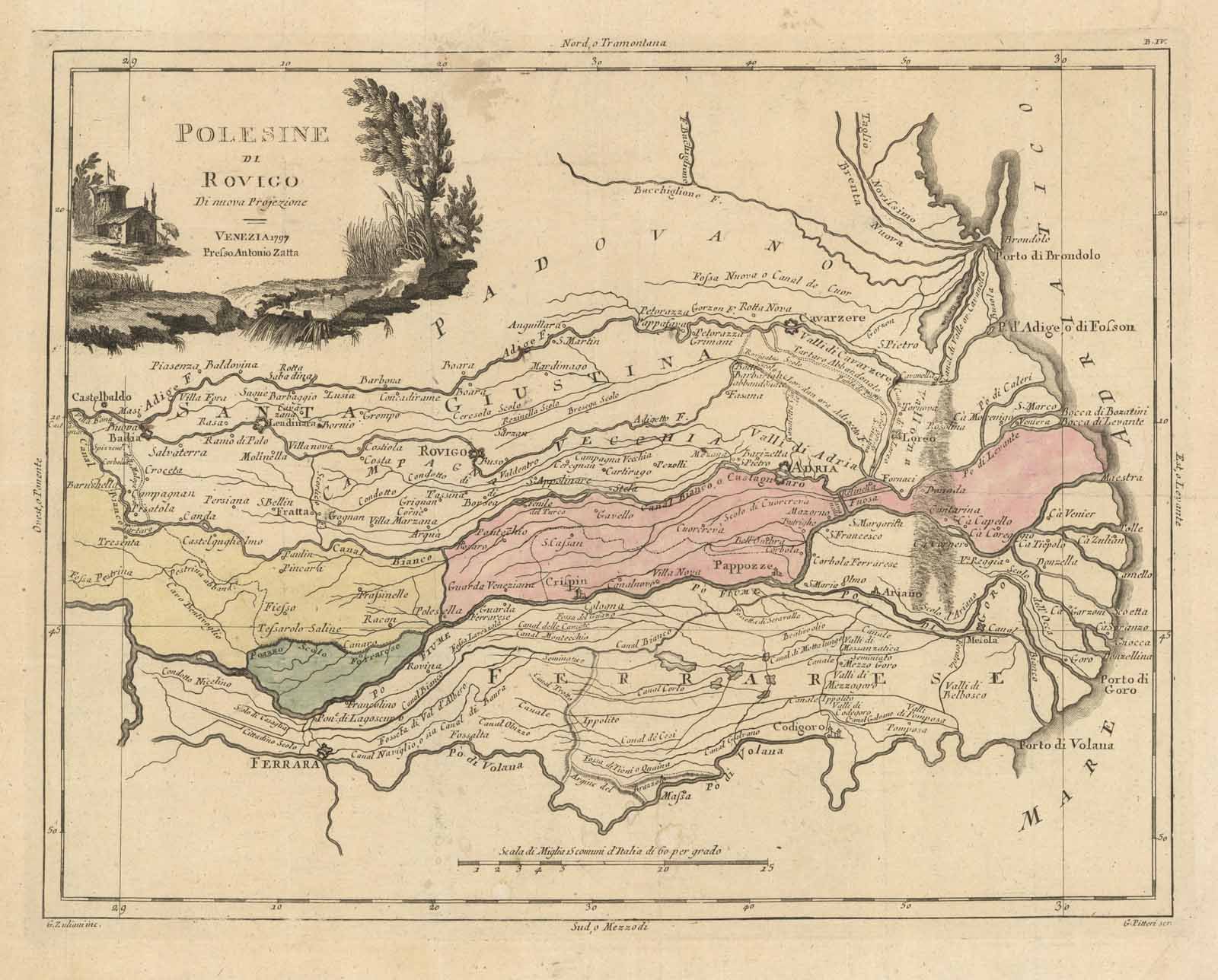 Carta geografica, entro margine graduato, raffigurante il territorio del Polesine di Rovigo. Secondo stato, in calce al cartiglio manca l'indicazione del privilegio di stampa. La carta era inserita nel volume "Ragioni del Polesine di Rovigo per formare un separato dipartimento" con lettera dedicatoria al cittadino Bonaparte generale in capo, scritta dalla Municipalità e popolo di Rovigo, stampato a Venezia da Pasquali nel 1797. Coloritura coeva all'acquerello. Pieghe editoriali. Rif: Marinelli 1881: 1296