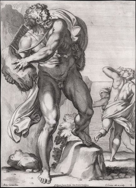 Tavola 8 della serie ' Galeria nel Palazzo Farnese in Roma.del Sereniss. Duca di Parma etc. dipinta da Annibale Carracci intagliata da Carlo Cesio, pubblicata da François Collignon nel 1657, raffigurante gli affreschi realizzati da Annibale Carracci per la Galleria Farnese. L’opera consiste in 44 incisioni all’acquaforte realizzate nella stessa direzione degli affreschi del Carracci. La fama di queste acqueforti, delle quali Cesi realizzò anche una controprova, si deve alla loro fedeltà agli originali. Furono molto apprezzate nonostante la freddezza che spesso questa fedeltà comportava. Dopo la prima stesura, vennero infatti replicate in ben altre cinque edizioni. ' Magnifica prova, impressa su carta vergata coeva, rifilata al rame, in ottimo stato di conservazione. Esemplare di primo stato con l’indirizzo di Collignon. Carlo Cesio (Antrodoco 1626 - Rieti 1687) è stato un pittore e incisore. Dopo la sua educazione a Rieti, alla fine degli anni ’40 del 1600, si trasferì a Roma dove divenne apprendista di Pietro da Cortona il quale lo presentò a molti mecenati, compresa la Regina Cristina di Svezia e il Cardinal Decio Azzolini. Inoltre, il maestro sostenne la candidatura dell’allievo per l’ammissione alla Accademia di S. Luca nel 1651. La serie di Carlo Cesio (o Cesi) costituisce la prima traduzione grafica italiana di tale ciclo di affreschi. La prima edizione di questa serie venne pubblicata a Roma prima del 1657 e ogni stampa presenta l'indirizzo del Collignon e un numero arabo di serie; la seconda edizione risale sempre al 1657 e si differenza dalla prima solo per l'inserimento di uno scritto intitolato "Argomento della Galeria Farnese dipinta da Annibale Carracci" pubblicato da Vitale Mascardi. Alla morte del Collignon (Roma 1687), le lastre vennero acquistate da Arnold Van Westerhout che ristampò la serie del Cesi con il proprio indirizzo (secondo stato) al posto di quello del Collignon, eliminò il privilegio e i numeri arabi, introducendo una numerazione romana delle tavole. Seguì un'edizione ove il titolo è accompagnato dalla scritta "In Roma nella libraria di Venenzio Monaldini al Corso". Nella quinta edizione l'indirizzo del Monaldini è stato sostituito da quello di Girolamo Mainardi; la sesta ed ultima edizione venne pubblicata a Roma nel 1753 da Venenzio Monaldini con un nuovo titolo: "Aedium farnesiarum tabulae ab Annibale Carraccio .". Bibliografia Bartsch, ' Le peintre-graveur ' (1803-1821) XXI.109.21-64; Bellini P., ' Carlo Cesio ' in “Italian Masters of the Seventeenth Century (The Illustrated Bartsch, vol. 47, 1983)”, pp. 78-99, nn. 021-064; E. Borea, ' Annibale Carracci e i suoi incisori ' (1986). Plate 8 from the series ' Galeria nel Palazzo Farnese in Roma.del Sereniss. Duca di Parma etc. dipinta da Annibale Carracci intagliata da Carlo Cesio ' an album after the fresco ceiling in the Farnese Gallery by Annibale Carracci, published by François Collignon in 1657. The work consists of 44 etchings made in the same direction as Carracci's frescoes. The fame of these etchings, of which Cesi also made a counterproof, is due to their fidelity to the originals. They were much appreciated despite the coldness that this fidelity often entailed. ' ' After the first edition by Collignon, they were in fact replicated in five other editions. ' Etching, printed on contemporary laid paper, trimmed to the platemark, in very good condition. First state with Collignon imprint. Carlo Cesio (Antrodoco 1626 - Rieti 1687) was an Italian painter and engraver. After his education in Rieti, in the late 1640s Cesi went to Rome, where he became a pupil of Pietro da Cortona, who later introduced him to various patrons, including Queen Christina of Sweden and Cardinal Decio Azzolini, and supported his matriculation at the Accademia di S Luca in 1651. The series by Carlo Cesio (or Cesi) constitutes the first Italian graphic translation of this cycle of frescoes. The first edition of this series was published in Rome before 1657 and each print bears Collignon's address and an Arabic series number. The second edition also dates back to 1657 and differs from the first only in the inclusion of an essay entitled 'Argomento della Galeria Farnese dipinta da Annibale Carracci' published by Vitale Mascardi. Upon Collignon's death (Rome 1687), the plates were purchased by Arnold Van Westerhout who reprinted the Cesi series with his own address (second state) instead of Collignon's, eliminated the privilege and the Arabic numerals, and introduced Roman numbering of the plates. This was followed by an edition where the title is accompanied by the inscription 'In Roma nella libraria di Venenzio Monaldini al Corso'. In the fifth edition, Monaldini's address was replaced by that of Girolamo Mainardi; the sixth and final edition was published in Rome in 1753 by Venenzio Monaldini with a new title: 'Aedium farnesiarum tabulae ab Annibale Carraccio .'. Bibliografia Bartsch, ' Le peintre-graveur ' (1803-1821) XXI.109.21-64; Bellini P., ' Carlo Cesio ' in “Italian Masters of the Seventeenth Century (The Illustrated Bartsch, vol. 47, 1983)”, pp. 78-99, nn. 021-064; E. Borea, ' Annibale Carracci e i suoi incisori ' (1986). Cfr.