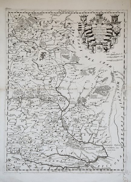Bella e rara mappa dettagliata dell'Ucraina pubblicata a Venezia da Vincenzo Coronelli.Nell'angolo in alto a destra un imponente cartiglio con dedica sormontato da stemmi e una dedica a Francesco Cornaro. Opera tratta dal ' Corso geografico universale, o sia la terra divisa nelle sue parti e subdistinta ne' suoi gran regni. Esposta in tavole geografiche ricorrette et accresciute di tutte le nuove scoperte, ad uso dell'Accademia Cosmografica degli Argonauti dal Padre Maestro Vincenzo Coronelli M. C. Cosmografo della Serenissima Republica di Venetia. Dedicata alla Santità di Nostro Signore Innocenzo XII. P. I. In Venetia, a spese dell'autore. MDCXCII. Coronelli visse un periodo di straordinaria fecondità editoriale a partire dal 1689, quando ebbe la cattedra di geografia presso l'Università alle Procuratie, con la pubblicazione, nel 1690, del primo volume dell'Atlante Veneto. In effetti sotto il nome di ' Atlante Veneto ' va tutta la raccolta di tredici opere composte nell'arco del decennio successivo, dall'Isolario ' allo ' Specchio del mare. In realtà solo alcune di tali opere possono definirsi atlante, e sono di valore molto disuguale, dato che si passa da opere originali e fondamentali come quelle citate o il ' Corso Geografico ' ad opere di compilazione o semplici raccolte di vedute. Il ' Corso Geografico ' uscì in diverse edizioni con numeri diversi di carte - sessantotto tavole nel 1689-92; di centosettantatré tavole nel 1692; duecentosessanta tavole, nel 1694-97 - che venivano vendute anche separatamente, al ritmo di sei carte al mese per due anni. Le carte furono incise tra il 1688 e il 1692 nell'attrezzatissima officina cartografica del convento dei Frari, dove lavoravano anche incisori stranieri. ' Incisione in ottime condizioni. Map of the Ukraine, all engraved in Coronelli's strong and distinctive style. In upper right corner a imposing dedicational cartouche surmounted by coats of arms and a dedication to Francesco Cornaro. The map is taken from ' Corso geografico universale, o sia la terra divisa nelle sue parti e subdistinta ne' suoi gran regni. Esposta in tavole geografiche ricorrette et accresciute di tutte le nuove scoperte, ad uso dell'Accademia Cosmografica degli Argonauti dal Padre Maestro Vincenzo Coronelli M. C. Cosmografo della Serenissima Republica di Venetia. Dedicata alla Santità di Nostro Signore Innocenzo XII. P. I. In Venetia, a spese dell'autore. MDCXCII. Coronelli lived a period of extraordinary editorial fecundity starting from 1689, when he had the chair of geography at the University at the Procuratie, with the publication, in 1690, of the first volume of the ' Atlante Veneto. Under the name of ' Atlante Veneto ' goes the entire collection of thirteen works composed over the next decade, from the ' Isolario ' to the ' Specchio del mare. ' In reality, only some of these works can be defined as atlas, and are of very unequal value, since we go from original and fundamental works such as those mentioned or the ' Corso Geografico ' to works of compilation or simple collections of views. The ' Corso Geografico ' came out in several editions with different numbers of maps - sixty-eight maps in 1689-92; one hundred and seventy-three maps in 1692; two hundred and sixty maps in 1694-97 - which were also sold separately, at the rate of six a month for two years. The maps were alle engraved between 1688 and 1692 in the well-equipped cartographic workshop of the Frari convent, where foreign engravers also worked. ' Engraving in excellent condition. Cfr.