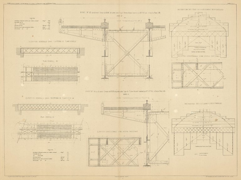 Due schemi di ponti in un'unica tavola. Inserita nell'opera "Album des Dessins d'exécution et des métrés de 36 Pont Métalliques du réseau des Chemins de fer Méridionaux italiens et d'un projet de pont en Acier avec travée centrale de 120 métres de portée" di Alfredo Cottrau (de Naples) e dedicata dall'autore a Chev. Giulio Marchesi. Medaglia d'argento a l'Esposizione Universale di Parigi del 1867. Pubblicata a Firenze nel 1868. Due piccoli fori di tarlo