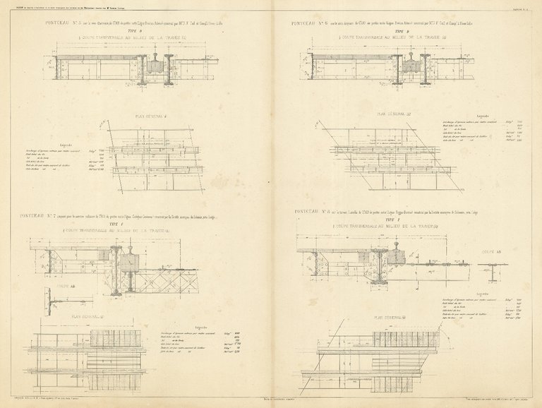 Quattro schemi di ponti in un'unica tavola. Inserita nell'opera "Album des Dessins d'exécution et des métrés de 36 Pont Métalliques du réseau des Chemins de fer Méridionaux italiens et d'un projet de pont en Acier avec travée centrale de 120 métres de portée" di Alfredo Cottrau (de Naples) e dedicata dall'autore a Chev. Giulio Marchesi. Medaglia d'argento a l'Esposizione Universale di Parigi del 1867. Pubblicata a Firenze nel 1868. Due piccoli fori di tarlo