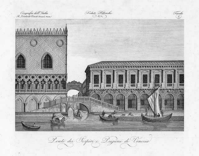 Veduta, animata da barche in primo piano, del ponte e della facciata delle prigioni