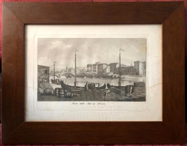 Incisione in rame all’acquatinta, 1830 circa, cm 14 x 21 circa (alla battuta della lastra) più margini. Piccola veduta animata del Ponte delle Navi in Verona, con imbarcazioni e uomini al lavoro in primo piano. Ben impressa, in margini e in buono stato. Con recente cornice in legno. .