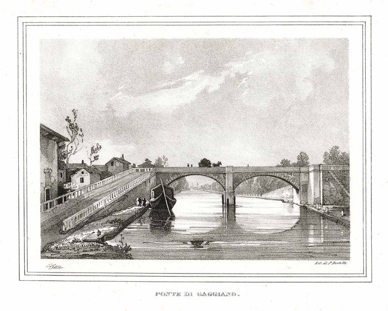 Veduta del ponte di Gaggiano sul Naviglio. Autore: Elena Giuseppe dis. & Bertotti lit. Luogo: Gaggiano - MI. Anno: 1836. Tecnica: litografia. Dimensioni: 168x224 mm in allegato foglio descrittivo