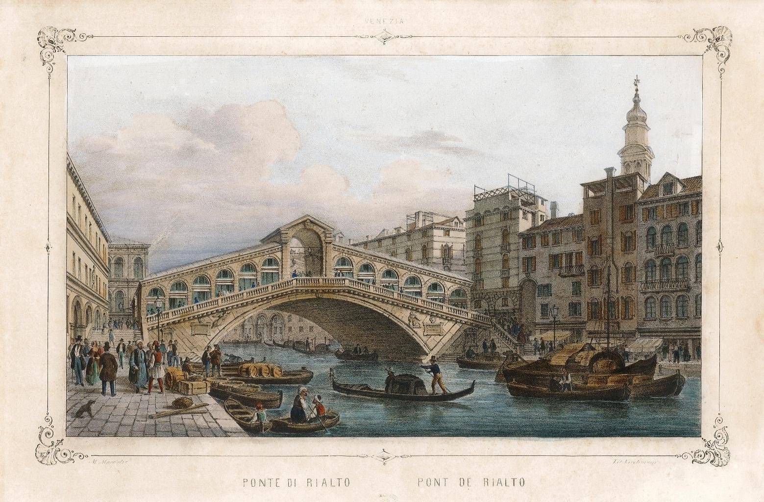 Stampa, antica ed originale, molto animata in bella coloritura coeva che raffigura il Canal Grande e Ponte di Rialto