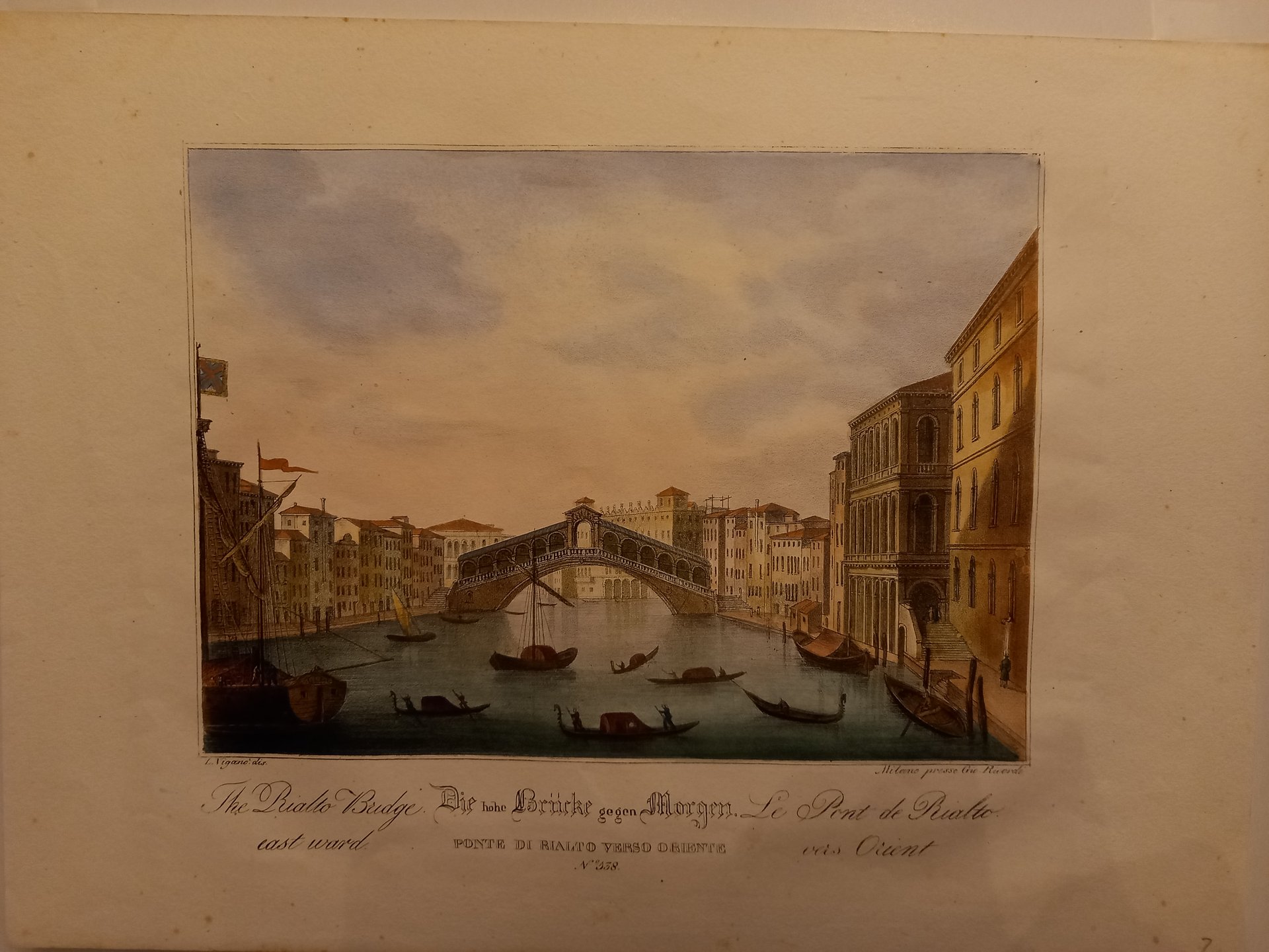 Litografia, 22,5 x 16 cm. Foglio 33 x 25 cm. Acquarellata. Fa parte dell'album: 24 vedute principali della città di Venezia. Milano: G. Cogliati, (183.?). Sotto l'immagine a sinistra L. Viganò dis., a destra Milano Lit. di Gio. Ricordi. Più in basso il titolo in quattro lingue. Viganò Luigi (1801-1864): incisore. Lithograph, 22.5 x 16 cm. Sheet 33 x 25cm. Watercolored. It is part of the album: 24 main views of the city of Venice. Milan: G. Cogliati, (183.?). At the top right the number: N 5. L. Viganò drawing, on the right Milano Lit. by Gio. Ricordi. Below the title in four languages. Viganò Luigi (1801-1864): engraver.