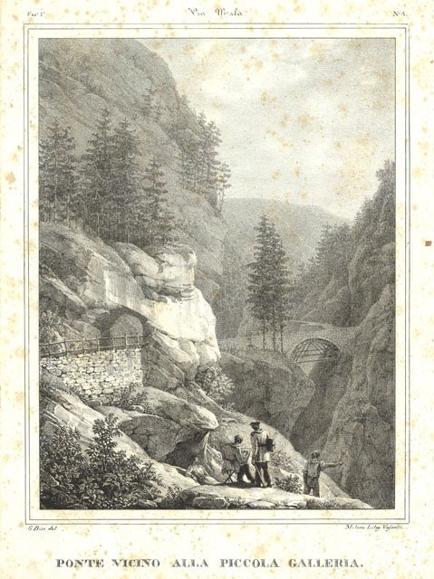 Rara veduta della Via Mala pubblicata a Milano. La stampa, controfondata, presenta piccole gore