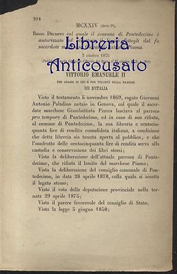 PONTEDECIMO REGIO DECRETO 1875 LEGATO MARCHESE GIOVANNI BATTISTA PIUMA antico