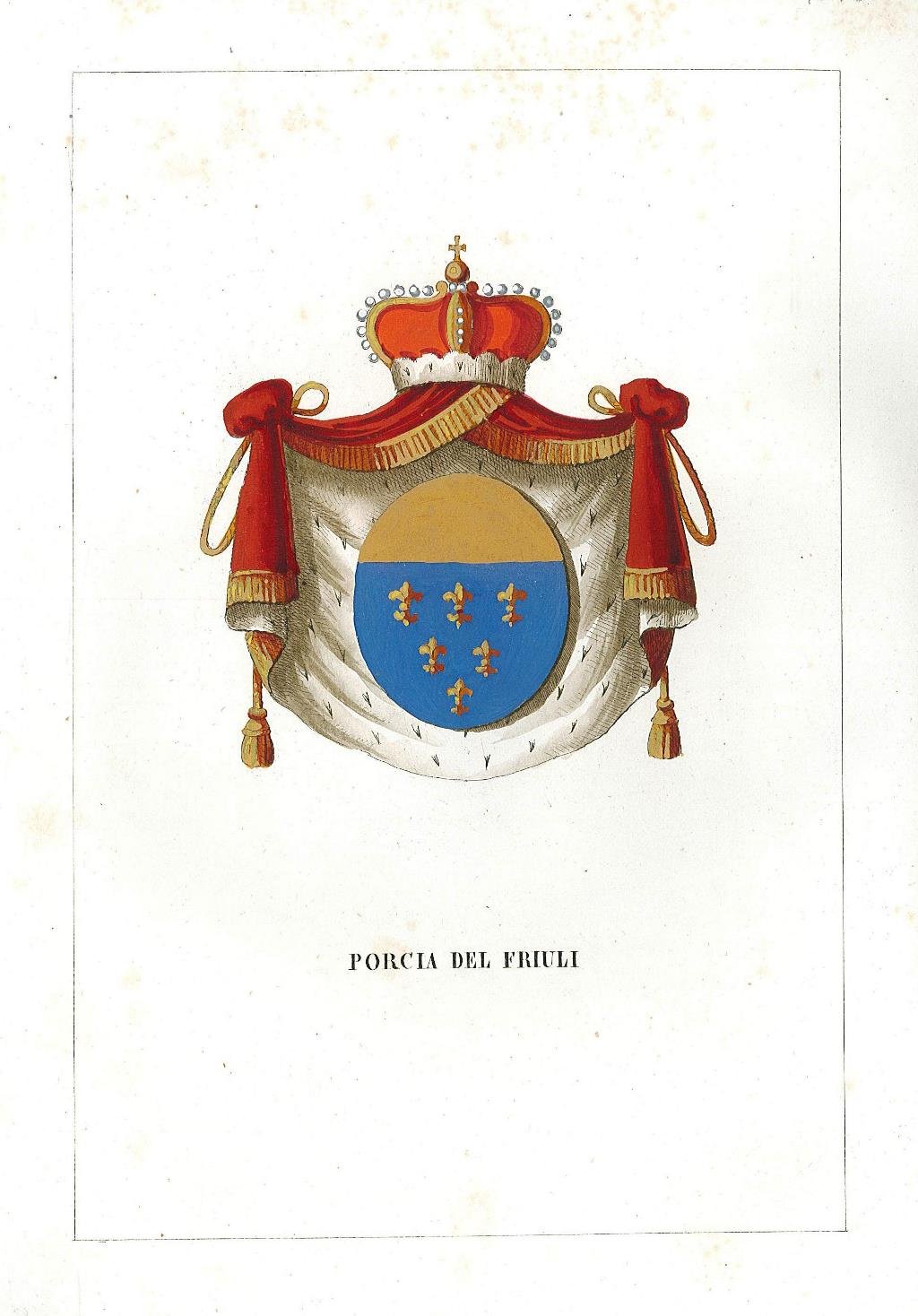 Stemma araldico della famiglia, finemente colorato a mano all'epoca con vivace acquerellatura a tempera. Inserita in una delle più importanti opere sull'araldica italiana in cui sono descritte ben 459 famiglie. L'opera è composta da bellissime incisioni di stemmi nobiliari in coloritura coeva e descrizioni genealogiche delle più importanti famiglie. Inserita in "Teatro araldico ovvero raccolta generale delle armi ed insegne gentilizie delle più illustri e nobili casate che sisterono un tempo e che tuttora fioriscono in tutta l'Italia. illustrate con relative genealogico-storiche nozioni da L. Tettoni e F. Saladini" Edita in Lodi e Milano pei tipi di Cl. Wilmant e figli dal 1841 al 1851. La stampa è accompagnata da pagine di testo storico descrittivo. Piccole macchioline