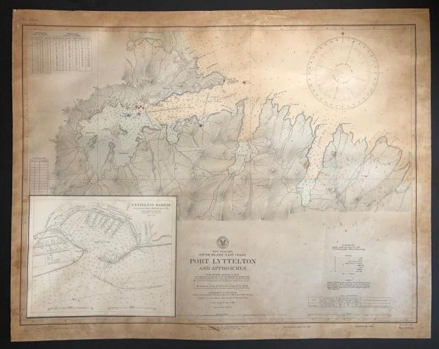 From British surveys to 1924. New Publication 2 Ed. Jan. Washington, 1933. Carta nautica originale di cm 57 x 72,5 circa (il foglio) che raffigura tutta la linea di costa con la baia di Port Lyttelton e suoi dintorni; in basso a sinistra, in riquadro "Lyttelton Harbore". Patina del tempo e margini ingialliti con alcune macchie e piccoli difetti marginali, nell'insieme comunque buona. .