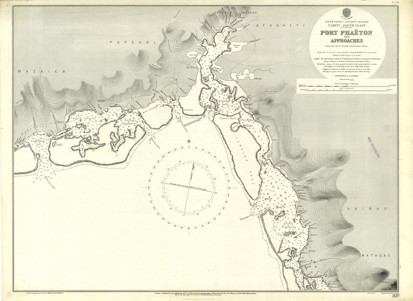 Port Phaeton and Approaches From the latest French Government Charts. London Published at the Admiralty, 9th Nov. 1900, under the Superintendence of Rear Admiral Sir W.J.L. Wharton, Hydrographer. Small corrections: 1922. Autore: Admiralty Charts. Luogo: Tahiti - Society Islands - Polynesia. Anno: 1900 [1922]. Tecnica: incisione. Dimensioni: 484x649 mm