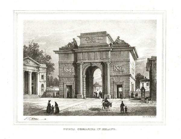 Stampa antica ed originale di Porta Comasina animata da personaggi