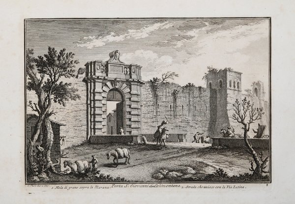 Veduta tratta dalla monumentale opera ' Delle magnificenze di Roma antica e moderna.Pubblicata in 10 volumi dal 1747 al 1761, l’opera presenta 238 incisioni in rame, ciascuna incisione con testo narrativo che fornisce informazioni storiche e documentarie. ' Conosciuto dai più semplicemente come il "maestro" di Giovanni Battista Piranesi, Giuseppe Vasi rivela in quest'opera monumentale la pienezza della sua creatività grafica. I 10 libri che la compongono hanno ognuno un frontespizio con titolo e data diversi: ' Libro primo che contiene le porte e mura; Libro secondo, che contiene le piazze principali di Roma con obelischi, colonne, ed altri ornamenti; Libro terzo, che contiene le basiliche e chiese antiche di Roma; Libro quarto che contiene i palazzi e le vie più celebri; Libro quinto che contiene i ponti e gli edifizj sul Libro sesto che contiene la chiese parrocchiali; Libro settimo che contiene i conventi e case dei chierici regolari; Libro ottavo che contiene i monasteri e conservatorj di donne; Libro nono che contiene i collegj, spedali, e luoghi pii; decimo che contiene le ville e giardini più rimarchevoli. Le ' Magnificenze ' forniscono un panorama completo e al tempo stesso anticonvenzionale dell'Urbe: così, insieme alle consuete, celeberrime inquadrature desunte dalla migliore tradizione vedutistica, si trova anche una Roma insolita, quella che, talvolta, non esiste più. A quest'opera, di centrale importanza nell'editoria romana di metà Settecento, l'Autore aveva lavorato per quasi un ventennio realizzando una monumentale guida dell'Urbe dove accanto alle consuete e celeberrime inquadrature tratte dalla migliore tradizione vedutistica, immortala anche scorci insoliti che sono poi scomparsi con il cambiare della città. Il testo che accompagna le vedute nel primo volume è opera di Giuseppe Bianchini, nel secondo di Orazio Orlandi e nei restanti del Vasi stesso. A partire dall'edizione del 1786, l'opera del Vasi, fu aggiornata dal figlio Mariano, che la pubblicò col titolo ' Raccolta delle più belle vedute antiche, e moderne di Roma, mostrando solo il nome del padre come autore. Questa nuova edizione presentava molte tavole della prima edizione, ed alcune nuove. Anche la pubblicazione di Mariano Vasi fu stampata più volte, sempre con l’aggiunta di nuove tavole. Esemplare tratto dalla seconda edizione dell'opera, edita nella seconda metà del '700. Acquaforte, stampata su carta vergata coeva, completa dei margini, in ottimo stato di conservazione. ' View taken from the monumental work ' Delle magnificenze di Roma antica e moderna. Published in 10 volumes from 1747 to 1761, the work features 238 copper engravings, each engraving with a narrative text that provides historical and documentary information. Known by most simply as the "master" of Giovanni Battista Piranesi, Giuseppe Vasi reveals in this monumental work the fullness of his graphic creativity. The 10 books that compose it each have a title page with a different title and date: ' Libro primo che contiene le porte e mura; Libro secondo, che contiene le piazze principali di Roma con obelischi, colonne, ed altri ornamenti; Libro terzo, che contiene le basiliche e chiese antiche di Roma; Libro quarto che contiene i palazzi e le vie più celebri; Libro quinto che contiene i ponti e gli edifizj sul Libro sesto che contiene la chiese parrocchiali; Libro settimo che contiene i conventi e case dei chierici regolari; Libro ottavo che contiene i monasteri e conservatorj di donne; Libro nono che contiene i collegj, spedali, e luoghi pii; decimo che contiene le ville e giardini più rimarchevoli. The ' Magnificences ' provide a complete and at the same time unconventional panorama of the City: thus, together with the usual, celebrated shots taken from the best tradition of ' vedutistica, one also finds an unusual Rome, one that, at times, no longer exists. The author had worked on this work, of central importance in Roman publishing in the middle of the eighteenth century, for almost twenty years, producing a monumental guide to the “Urbe” where, alongside the usual and famous shots taken from the best tradition of ' vedutistica, he also immortalized unusual views that have since disappeared with the change of the city. The text that accompanies the views in the first volume is by Giuseppe Bianchini, in the second by Orazio Orlandi and in the remaining ones by Vasi himself. Starting from the edition of 1786, the work of Vasi, was updated by his son Mariano, who published it under the title ' Raccolta delle più belle vedute antiche, e moderne di Roma, showing only the name of his father as author. This new edition presented many plates of the first edition, and some new ones. The publication of Mariano Vasi was also printed several times, always with the addition of new plates. ' ' From the ' second ' edition of Vasi's ' Delle Magnificenze di Roma Antica e Moderna. Etching, printed on contemporary laid paper, in very good condition. Cfr. Scalabroni 72