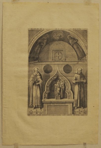 Incisione su rame, 250 x 171 mm (alla battuta), foglio di 229 x 341 mm. Carta vergata forte e filigrana a due lune. All'interno dell'incisione le scritte, in alto: "Eruni duo viri"; in basso: "Unus hinc", "Etalius inde". In basso: "Et venie homo insignitus caracteribus Iesu Christi crucefixi abb.". Bel foglio a pieni margini. Proveniente da "Habiti d'huomeni et donne venetiane con la processione della Ser.ma signoria et altri particolari cioè trionfi feste cerimonie publiche della nobilissima città di Venetia. ; La città di Venetia con l'origine e governo di quella. ; Habiti che gia' tempo usavano le donne vinetiane". Cicogna. Delle inscrizioni veneziane, volume V p. 439. Giacomo Franco (1550-1620). Figlio naturale del pittore e incisore Battista Franco e da tale Francesca da Urbino, nacque a Venezia, o più probabilmente a Urbino, nel 1550. Esercitò, operando sempre a Venezia, il mestiere di incisore, calcografo, editore benché nel suo testamento, rogato il 16 giugno 1620 dal notaio Fausto Doglioni, egli si definisca "desegnador". Il suo nome non ricorre mai negli atti dell'arte dei "libreri, stampatori e ligadori", mentre si trova negli elenchi della corporazione dei pittori, alle date 1606 e 1619, termini che indicano probabilmente l'anno di iscrizione all'arte, e quello di cessazione dell'attività.