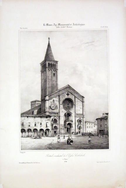 Parigi, 1850 circa. Tratta da “Le Moyen Age Monumental et Archéologique”, litografia, b/n, cm 30,3 x 44,5. Erroneamente viene segnalata come la “Cattedrale di Parma” ma è in epoca medievale. Uno piccolo strappo sul margine laterale sinistro e una piega percettibile in alto a sinistra ma nell'insieme buono stato.