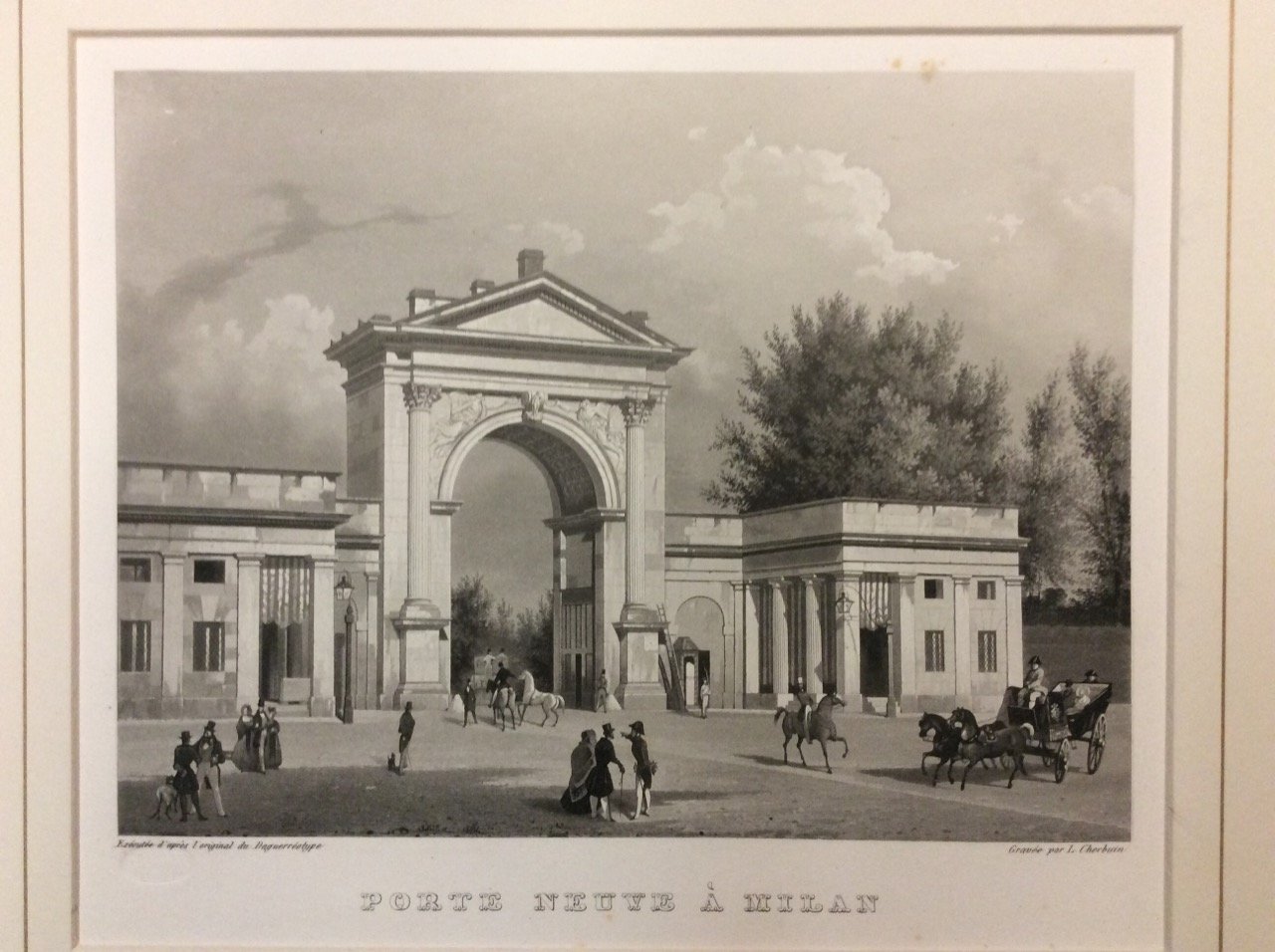 Acquatinta (mm. 162 x 216 più grandi margini), incisa da Cherbuin, sotto passe-partout.<br>La veduta fa parte della bella serie Recueil des vues principales de Milan, exécutées d'après le daguerréotype et gravées par L. Cherbuin.<br>In questa raccolta, al disegno proprio o altrui, da cui l'incisore traeva la stampa, fu sostituita l'impressione meccanica della lastra fotografica allora inventata dal Daguerre. <br>Cfr. Arrigoni Milano nelle vecchie stampe,I, n. 193/21.<br>Ben conservata.