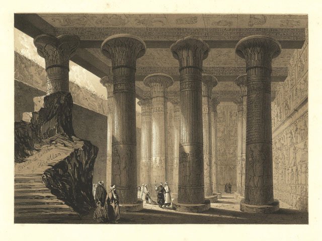Litografia, antica ed originale, raffigurante la veduta del portico del tempio di Esneh