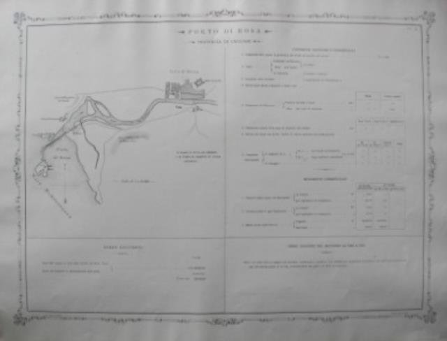 Da “Album dei porti di I, II e III classe illustrato dalle notizie nautiche e commerciali d’ogni porto e della statistica delle opere esistenti e di quelle eseguite nel decennio 1861 al 1870”, Roma, Civelli, s.d. (ma 1872 ca.), litografia, b/n, cm 44 x 57,5 (il foglio). Grande figura del porto descritto. Esemplare in ottimo stato di conservazione. Rara.