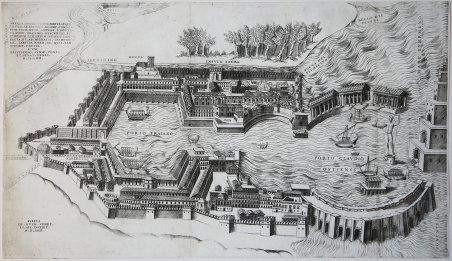 Bulino, 1554, inciso da Giulio de Musi per l'editore Michele Tramezino.Esemplare nel primo stato di cinque descritto in Bifolco-Ronca (2018) - primo di tre per Alessia Alberti - con la data originaria del 1554, che viene successivamente cambiata in 1558.Come diverse altre opere pubblicate dalla tipografia di Francesco e Michele Tramezino, la lastra venne acquistata da Antonio Lafreri, che la inserisce nel suo "Speculum Romanae Magnificentiae" (cfr. Alberti n. A 113, Speculum di Padova BC (I. 3282, tav. 32).Iscritto firmato e datato in alto a sinistra: « ANTIQVA SPECIES VRBIVM PORTVS ATQVE / OSTIÆ(*) AB DIVERSIS RO[MANIS] IMP[ERATORIBVS] CONDITA/RVM ITEM DVOR[VM] AMPLISS[IMORVM] PORTVVM / CLAVDII TRAIANIQ[VE] DESCRIPTIO PER PYRRHVM LIGORIVM NEAPOLITANVM / FACTA ET AB MICHAELE TRAMEZINO EX TABVLIS AENEIS IN QVAS EAM INCIDIT EXCVS[S]A / CVM / PRIVILEGIO SVMMI PONT[IFICIS] ET SENAT[VS] VENET[I] MDLIIII » [Immagine delle città di Porto e di Ostia fondate da diversi imperatori romani, e raffigurazione dei due amplissimi porti di Claudio e di Traiano, fatta da Pirro Ligorio, di Napoli, e da Michele Tramezzino stampate da lastre di bronzo su cui egli le incise - Con privilegio del Sommo Pontefice e del Senato di Venezia nel 1554.]Si tratta di una ricostruzione storica ad opera dell’archeologo Pirro Ligorio, che raffigura il porto voluto dall’imperatore Claudio, poi ampliato da Traiano. I lavori iniziarono tra il 42 ed il 46, e fu realizzato un porto aperto a ponente, protetto da due moli. Tuttavia, i continui insabbiamenti che subiva, indussero a ulteriori lavori che portarono alla costruzione di un ulteriore bacino interno, ad oriente, terminato sotto l’imperatore Traiano nell’anno 103. L’opera, sebbene a carattere topografico, rientra nel filone delle antichità romane, finalizzate a far conoscere al grande pubblico la maestosità delle architetture romane. Si tratta del prototipo delle piante sul porto di Ostia, sebbene alcuni studiosi (cfr. Marigliani p. 86) sostengano che la prima opera a stampa si deve ad Antonio Labacco nel 1552. Tuttavia, il Libro d’Antonio Labacco appartenente a l’architettura nel qual si figurano alcune notabili antiquita di Roma, che contiene una pianta del porto di Ostia, non viene stampato prima del 1559. Il Ligorio fu direttamente coinvolto nel rilievo e nel disegno dell’antico porto di Ostia; è conosciuto un manoscritto ad inchiostro, a lui attribuito (mm 700x1150), conservato all’Istituto Nazionale d’Archeologia e Storia dell’Arte di Roma (Lugli, fig. 1). Una seconda stesura dell’opera viene edita nel 1558. La lastra può essere identificata con quella presente nel catalogo di Antonio Lafreri, in cui confluirono molte opere del Tramezzino, elencata tra le Città & Fortezze come “Porto d’Hostia” (numero 136). Attraverso un percorso editoriale che non siamo riusciti a ricostruire, fu acquistata da Giovan Battista de Rossi, autore di una ristampa che conserva la data 1558. Dalla tipografia de Rossi fu pubblicata una successiva stesura, con data 1691 (Lugli 1947). L’ultima edizione della lastra fu curata, due secoli dopo, da Carlo Losi (cfr. Bifolco-Ronca, 2018, tav. 1164). Lo ' Speculum ' ebbe origine nelle attività editoriali di Antonio Salamanca e Antonio Lafreri (Lafrery). Durante la loro carriera editoriale romana, i due editori - che hanno lavorato insieme tra il 1553 e il 1563 - hanno avviato la produzione di stampe di architettura, statuaria e vedutistica della città legate alla Roma antica e moderna. Le stampe potevano essere acquistate individualmente da turisti e collezionisti, ma venivano anche acquistate in gruppi più grandi che erano spesso legati insieme in un album. Nel 1573, Lafreri commissionò a questo scopo un frontespizio, dove compare per la prima volta il titolo Speculum Romanae Magnificentiae. Alla morte di Lafreri, due terzi delle lastre di rame esistenti andarono alla famiglia Duchetti (Claudio e Stefano), mentre un altro terzo fu dis. Engraving, 1554, by Giulio de Musi for the publisher Michele Tramezino.Example of the first state of five described in Bifolco-Ronca (2018) - first of three for Alessia Alberti - with the original date of 1554, which is later changed to 1558.Like several other works published by the typography of Francesco and Michele Tramezino, the plate was purchased by Antonio Lafreri, who included it in his "Speculum Romanae Magnificentiae" (see Alberti n. A 113, Speculum of Padua BC (I. 3282, table 32).Inscribed signed and dated at the top left: "ANTIQVA SPECIES VRBIVM PORTVS ATQVE / OSTIÆ AB DIVERSIS RO[MANIS] IMP[ERATORIBVS] CONDITARVM ITEM DVOR[VM] AMPLISS[IMORVM] PORTVVM CLAVDII TRAIANIQ[VE] DESCRIPTIO PER PYRRHVM LIGORIVM NEAPOLITANVM FACTA ET AB MICHAELE TRAMEZINO EX TABVLIS AENEIS IN QVAS EAM INCIDIT EXCVS[S]A CVM / PRIVILEGIO SVMMI PONT[IFICIS] ET SENAT[VS] VENET[I] MDLIIII ".It is a historical reconstruction by the archaeologist Pirro Ligorio, which depicts the port wanted by Emperor Claudius, later enlarged by Trajan. The work began between 42 and 46, and it was made an open port to the west, protected by two piers. However, the continuous silting up that it underwent, led to further works that led to the construction of a further inner basin, to the east, finished under the Emperor Trajan in the year 103. The work, although topographic, is part of the Roman antiquities, aimed at making known to the general public the majesty of Roman architecture. It is the prototype of the plans on the port of Ostia, although some scholars (cf. Marigliani p. 86) claim that the first printed work is due to Antonio Labacco in 1552. However, the Book of Antonio Labacco belonging to the architecture in which there are some notable antiquities of Rome, which contains a plan of the port of Ostia, is not printed before 1559. Ligorio was directly involved in the survey and design of the ancient port of Ostia; an ink manuscript, attributed to him (mm 700x1150), preserved at the National Institut