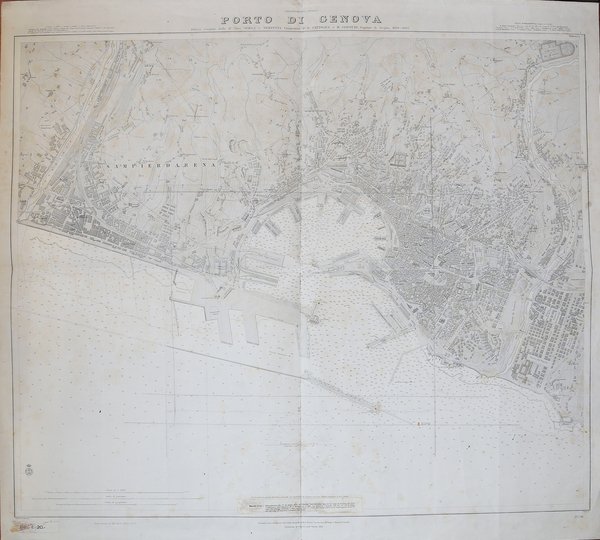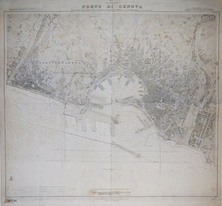 Carta nautica stampata dall’Istituto Idrografico della Marina. Aggiornata al 1916. La storia dell'Istituto Idrografico della Marina inizia pochi anni dopo l'unificazione nazionale con la creazione a Livorno, nel 1875, dell'Ufficio Centrale per il Servizio Scientifico della Regia Marina, dal quale avrebbero dovuto dipendere Uffici Dipartimentali eredi delle funzioni di elaborazione cartografica proprie delle istituzioni preunitarie. Fu invece creato il solo Ufficio Dipartimentale di Genova, presso il Forte San Giorgio, che a sua volta lasciò il posto, nel 1872, dall'ente cartografico nazionale denominato Ufficio Idrografico della Regia Marina. Nel 1899 tale denominazione fu trasformata in quella attuale di Istituto Idrografico della Marina. L'istituto fu fondato con regio decreto il 26 dicembre 1872 e alla sua guida fu chiamato il capitano di fregata, matematico e idrografo Giovan Battista Magnaghi, con il compito di eseguire il rilievo idrografico dei mari italiani e di produrre la documentazione nautica nazionale. Nel dopoguerra, oltre a ricognizioni per procedere all'aggiornamento delle carte nautiche, venne realizzata una nuova rete di triangolazione costiera. Incisione su zinco, con margini, in buono stato di conservazione. Bibliografia Amedeo Benedetti, L'Istituto Idrografico della Marina, in Charta Geographica, 93, ottobre 2007, pp. 12–13; Paola Presciuttini, L'Istituto Idrografico della Marina in Forte San Giorgio, Genova, I.I.M., 1995. The history of the Istituto Idrografico della Marina began a few years after the national unification with the creation in Livorno, in 1875, of the Ufficio Centrale per il Servizio Scientifico della Regia Marina, which should have depended on Departmental Offices heirs of the functions of cartographic processing of pre-unitary institutions. It was instead created only the Ufficio Dipartimentale di Genova, at Forte San Giorgio, which in turn left the place, in 1872, by the national mapping body called Ufficio Idrografico della Regia Marina. In 1899 this name was changed to the current name of Istituto Idrografico della Marina. The institute was founded by royal decree on 26 December 1872 and at its head was called the frigate captain, mathematician and hydrographer Giovan Battista Magnaghi, with the task of performing the hydrographic survey of the Italian seas and to produce the national nautical documentation. After the war, in addition to reconnaissance to update the nautical charts, a new coastal triangulation network was created. Engraving on zinc, with margins, in good condition. Bibliografia Amedeo Benedetti, L'Istituto Idrografico della Marina, in Charta Geographica, 93, ottobre 2007, pp. 12–13; Paola Presciuttini, L'Istituto Idrografico della Marina in Forte San Giorgio, Genova, I.I.M., 1995. Cfr.