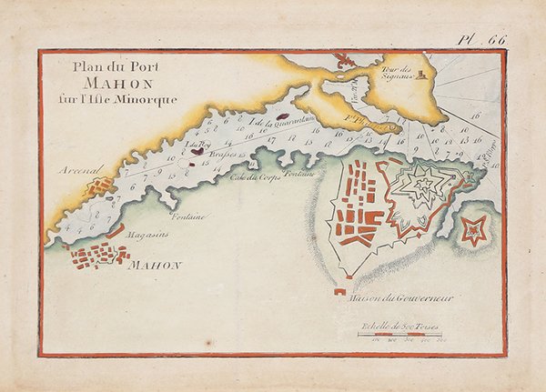 Piano nautico tratto dal " Recueil des principaux plans des ports & rades de la Méditerranée" di Josepgh Roux, pubblicato per la prima volta a Marsiglia nel 1764 e successivamente ristampato - ampliato - a Genova da Yves Gravier con il titolo "Recueil de 163 principaux plans des ports et rades de la Mediterranée" (1804).Ulteriore edizione dell'opera, con il titolo "Plans des ports ed des rades de la Mer Méditerranée." è stampata a Livorno da Carlo Tesi nel 1858. Incisione in rame, finemente acquarellata a mano, in ottimo stato di conservazione. First published in the "Recueil des principaux plans des ports et rades de la Mer Mediterranee", 1764, this nice nautical chart is taken from the rare "Plans des ports ed des rades de la Mer Méditerranée." published in Leghorn by Carlo Tesi, 1858. Copperplate with fine colouring, in very good condition. Cfr.