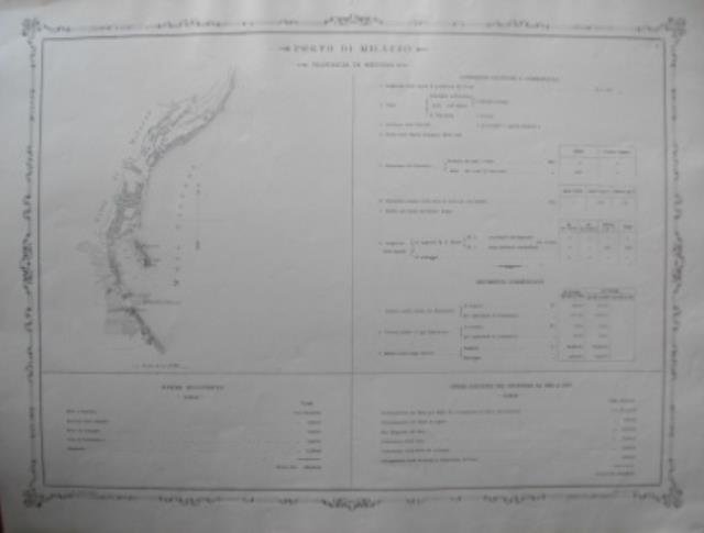 Da “Album dei porti di I, II e III classe illustrato dalle notizie nautiche e commerciali d’ogni porto e della statistica delle opere esistenti e di quelle eseguite nel decennio 1861 al 1870”, Roma, Civelli, s.d. (ma 1872 ca.), litografia, b/n, cm 44 x 57,5 (il foglio). Grande figura del porto descritto. Esemplare in ottimo stato di conservazione. Rara.