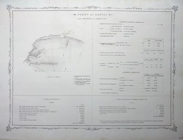 Da “Album dei porti di I, II e III classe illustrato dalle notizie nautiche e commerciali d’ogni porto e della statistica delle opere esistenti e di quelle eseguite nel decennio 1861 al 1870”, Roma, Civelli, s.d. (ma 1872 ca.), litografia, b/n, cm 44 x 57,5 (il foglio). Grande figura del porto descritto. Esemplare in ottimo stato di conservazione. Rara.