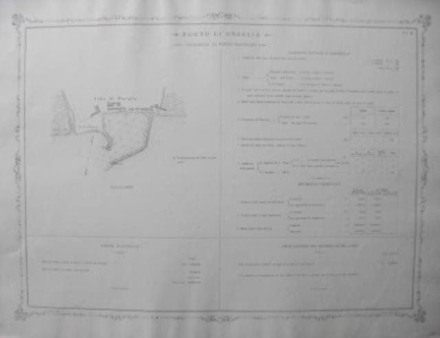 Da “Album dei porti di I, II e III classe illustrato dalle notizie nautiche e commerciali d’ogni porto e della statistica delle opere esistenti e di quelle eseguite nel decennio 1861 al 1870”, Roma, Civelli, s.d. (ma 1872 ca.), litografia, b/n, cm 44 x 58 (il foglio). Grande figura del porto descritto. Esemplare in ottimo stato di conservazione. Rara.