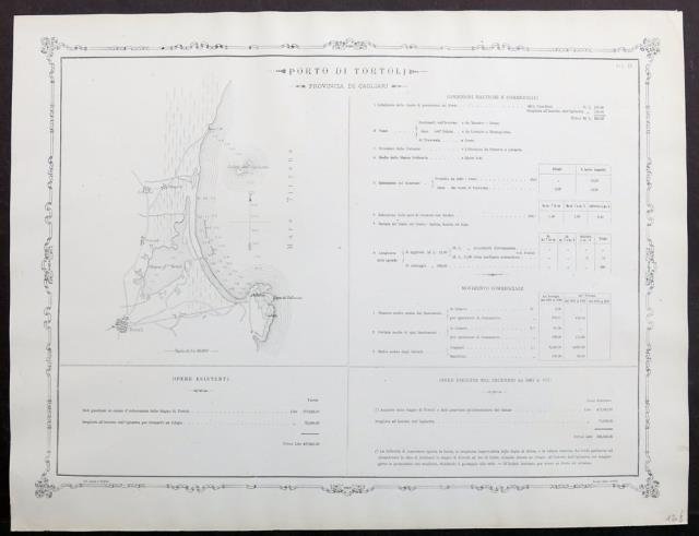 Da “Album dei porti di I, II e III classe illustrato dalle notizie nautiche e commerciali d’ogni porto e della statistica delle opere esistenti e di quelle eseguite nel decennio 1861 al 1870”, Roma, Civelli, s.d. (ma 1872 ca.), litografia, b/n, cm 44 x 57,5 (il foglio). Grande figura del porto descritto. Esemplare in ottimo stato di conservazione. Rara.