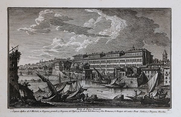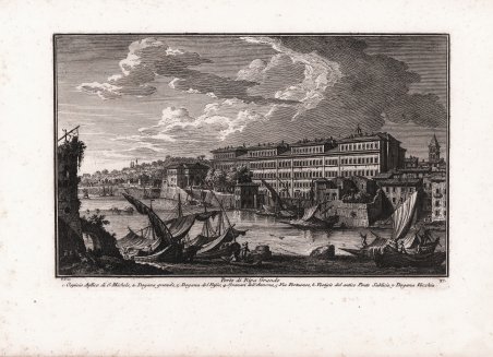 Veduta tratta dalla monumentale opera ' Delle magnificenze di Roma antica e moderna.Pubblicata in 10 volumi dal 1747 al 1761, l’opera presenta 238 incisioni in rame, ciascuna incisione con testo narrativo che fornisce informazioni storiche e documentarie. ' Conosciuto dai più semplicemente come il "maestro" di Giovanni Battista Piranesi, Giuseppe Vasi rivela in quest'opera monumentale la pienezza della sua creatività grafica. I 10 libri che la compongono hanno ognuno un frontespizio con titolo e data diversi: ' Libro primo che contiene le porte e mura; Libro secondo, che contiene le piazze principali di Roma con obelischi, colonne, ed altri ornamenti; Libro terzo, che contiene le basiliche e chiese antiche di Roma; Libro quarto che contiene i palazzi e le vie più celebri; Libro quinto che contiene i ponti e gli edifizj sul Libro sesto che contiene la chiese parrocchiali; Libro settimo che contiene i conventi e case dei chierici regolari; Libro ottavo che contiene i monasteri e conservatorj di donne; Libro nono che contiene i collegj, spedali, e luoghi pii; decimo che contiene le ville e giardini più rimarchevoli. Le ' Magnificenze ' forniscono un panorama completo e al tempo stesso anticonvenzionale dell'Urbe: così, insieme alle consuete, celeberrime inquadrature desunte dalla migliore tradizione vedutistica, si trova anche una Roma insolita, quella che, talvolta, non esiste più. A quest'opera, di centrale importanza nell'editoria romana di metà Settecento, l'Autore aveva lavorato per quasi un ventennio realizzando una monumentale guida dell'Urbe dove accanto alle consuete e celeberrime inquadrature tratte dalla migliore tradizione vedutistica, immortala anche scorci insoliti che sono poi scomparsi con il cambiare della città. Il testo che accompagna le vedute nel primo volume è opera di Giuseppe Bianchini, nel secondo di Orazio Orlandi e nei restanti del Vasi stesso. A partire dall'edizione del 1786, l'opera del Vasi, fu aggiornata dal figlio Mariano, che la pubblicò col titolo ' Raccolta delle più belle vedute antiche, e moderne di Roma, mostrando solo il nome del padre come autore. Questa nuova edizione presentava molte tavole della prima edizione, ed alcune nuove. Anche la pubblicazione di Mariano Vasi fu stampata più volte, sempre con l’aggiunta di nuove tavole. Esemplare tratto dall'edizione del 1786. Acquaforte, stampata su carta vergata coeva, completa dei margini, in ottimo stato di conservazione. ' View taken from the monumental work ' Delle magnificenze di Roma antica e moderna. Published in 10 volumes from 1747 to 1761, the work features 238 copper engravings, each engraving with a narrative text that provides historical and documentary information. Known by most simply as the "master" of Giovanni Battista Piranesi, Giuseppe Vasi reveals in this monumental work the fullness of his graphic creativity. The 10 books that compose it each have a title page with a different title and date: ' Libro primo che contiene le porte e mura; Libro secondo, che contiene le piazze principali di Roma con obelischi, colonne, ed altri ornamenti; Libro terzo, che contiene le basiliche e chiese antiche di Roma; Libro quarto che contiene i palazzi e le vie più celebri; Libro quinto che contiene i ponti e gli edifizj sul Libro sesto che contiene la chiese parrocchiali; Libro settimo che contiene i conventi e case dei chierici regolari; Libro ottavo che contiene i monasteri e conservatorj di donne; Libro nono che contiene i collegj, spedali, e luoghi pii; decimo che contiene le ville e giardini più rimarchevoli. The ' Magnificences ' provide a complete and at the same time unconventional panorama of the City: thus, together with the usual, celebrated shots taken from the best tradition of ' vedutistica, one also finds an unusual Rome, one that, at times, no longer exists. The author had worked on this work, of central importance in Roman publishing in the middle of the eighteenth century, for almost twenty years, producing a monumental guide to the “Urbe” where, alongside the usual and famous shots taken from the best tradition of ' vedutistica, he also immortalized unusual views that have since disappeared with the change of the city. The text that accompanies the views in the first volume is by Giuseppe Bianchini, in the second by Orazio Orlandi and in the remaining ones by Vasi himself. Starting from the edition of 1786, the work of Vasi, was updated by his son Mariano, who published it under the title ' Raccolta delle più belle vedute antiche, e moderne di Roma, showing only the name of his father as author. This new edition presented many plates of the first edition, and some new ones. The publication of Mariano Vasi was also printed several times, always with the addition of new plates. ' View taken from 1786 edition of the Vasi’s ' Delle Magnificenze di Roma Antica e Moderna. Etching, printed on contemporary laid paper, in very good condition. Cfr. Scalabroni, 184