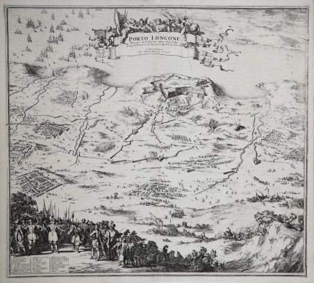 Veduta obliqua di Porto Longone (Porto Azzurro) sull'isola d'Elba, una delle città dello Stato spagnolo dei Presidi che fu catturata dai francesi nel 1646 e poi riconquistata dalle forze spagnole e alleate italiane e tedesche comandate da Giovanni d'Austria (il Giovane) (7 aprile 1629-17 settembre 1679). Guerra franco-spagnola (1645-1659). Orientatamento in alto a sud-est. La vista è presa dalla catena di colline a nord-ovest del forte, dando una vista dominante sulle linee di circonvallazione e sugli accampamenti degli eserciti assedianti e sul Forte di Longone. Esemplare tratto dal primo volume del Nouveau Theatre de l'Italie pubblicato ad Amsterdam nel 1704/5 e nel 1724, quale integrazione al progetto di Johannes Baleu, iniziato nel 1663, del grande "libro delle città", manchevole delle piante di gran parte della parte settentrionale della penisola. Il Blaeu, durante la sua lunga attività editoriale pubblica tre volumi sulle città italiane. Nel 1663 i primi tre, suddivisi in Stato della Chiesa, Roma e Regno di Napoli e Sicilia. Alla sua morte i suoi eredi danno alla luce altri due volumi datati 1682 incentrati sulle città del Piemonte e della Savoia, poi ristampati da altri editori nel 1693 e 1697. Il francese Pierre Mortier pubblica una ristampa nel 1704/5, intitolata “Nouveau Theatre de l’Italie”.L’opera è in quattro volumi e comprende le lastre del Blaeu, ritoccate e modificate in piccola parte, integrate dall’aggiunta di numerose nuove mappe di proprio disegno, raffiguranti le città della parte settentrionale della penisola, racchiuse nel primo volume dell’opera.L’atlante del Mortier venne pubblicato con testo latino, francese ed olandese. La particolarità che differenzia le due edizioni di Blaeu e Mortier è rappresentata dal fatto che il testo non è al verso della singola mappa (che quindi è bianca nel retro), ma si trova all’inizio di ogni singolo volume. Il grande successo dell’opera diede origine ad un’ulteriore ristampa, praticamente identica, curata da R. Alberts ed edita nel 1724/5.Incisione in rame, in buono stato di conservazione A low-high oblique view of Porto Longone on the island of Elba, one of the towns of the Spanish Stato dei Presidi which was captured by the French in 1646 and then retaken by the Spanish and allied Italian and German forces commanded by John of Austria (the Younger) (7 April 1629-17 September 1679). Franco-Spanish War (1645-1659). Oriented south-east top. The view is taken from the range of hills to the north-west of the fort, giving a commanding view over the lines of circumvallation and encampments of the besieging armies and across to the Fort of Longone. Map taken from the first volume of the "Nouveau Theatre de l'Italie" published in Amsterdam in 1704/5 and 1724. Etching, very good codition. Cfr.