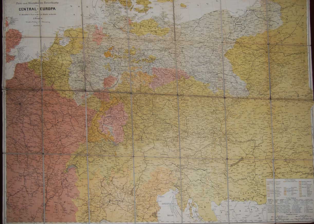 Cm. 82x63, carta litografica dell'Europa centrale, telata, divisa in 28 riquadri. In buono stato (good copy).