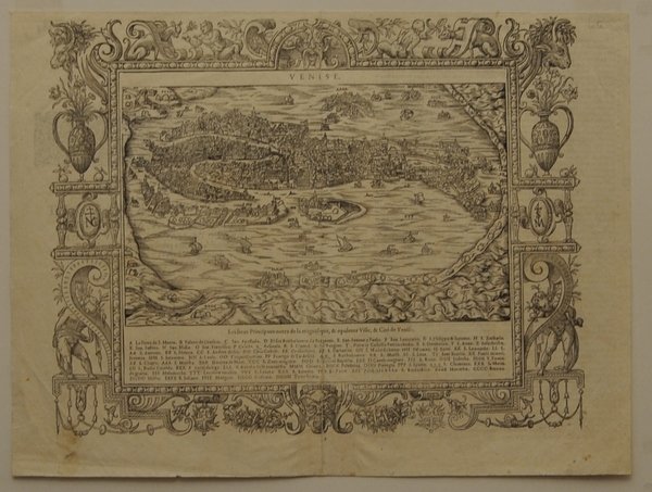 (370 X 300) mm dimensione della tavola. (157 X 252) mm dimensione della veduta. Filigrana con lettera B sormontata da giglio. Incisore anonimo. Proviene da "La Cosmographie universelle de tout le monde". Belle Forest Francois (1530-1585). Cassini N.21: "La pianta è inserita in una sontuosa cornice architettonica, ricca di elementi araldici, putti, animali, ecc. In alto, al centro in caratteri tipografici "Pourtraict de la magnique Citè de Venise". Nell'interno della cornice e al di sopra della pianta:"Venise". Lungo il lato inferiore, entro il riquadro, 71 rimandi in italiano, segnati da lettere. Al centro del lato sinistro della cornice, entro uno scudo, il monogramma dell'editore Nicolas Chesneau che esercitò pure l'attività di incisore in alcune opere uscite a Parigi tra il 1556 e il 1583. Al centro del lato opposto, entro uno scudo, il monogramma di un artista ignoto, probabilmente un disegnatore tedesco della seconda metà del XVI secolo." Moretto N. 31.