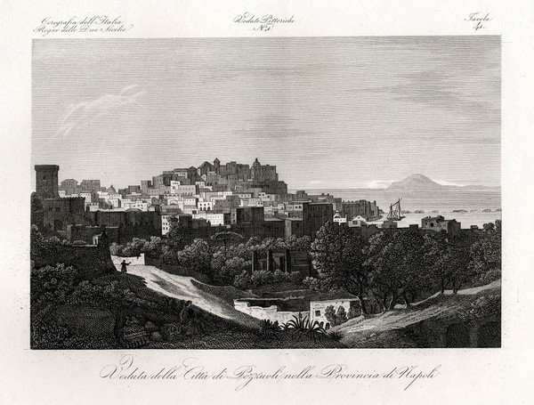 POZZUOLI - "Veduta della Città di Pozzuoli." Bellissima veduta prospettica della città con il mare sullo sfondo.
