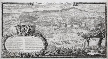 Raffigura la battaglia di Varsavia nel 1656. Il grande cartiglio del titolo incorpora una legenda per la localizzazione delle varie forze. Tavola tratta da Histoire du Règne de Charles-Gustave, Roy De Suède, Comprise en sept commentaires [.] traduite rn François sur le Latin de Monsieur le Baron Samuel De Pufendorf. Imprime à Nuremberg: Aux Frais De Chrisophle Riegel, 1697. La magistrale storia del regno di Carl Gustav (1654-1660), scritta da Pufendorf mentre era storiografo reale, fu pubblicata per la prima volta in latino nel 1696. La maggior parte del regno di Carl Gustav riguarda la Seconda guerra del Nord in Polonia-Lituania, che costituisce la parte principale della narrazione di Pufendorf, insieme alle numerose tavole, vedute di città e mappe del territorio in questione. Include una lunghissima tavola più volte ripiegata che raffigura il corteo funebre di Carl Gustav a Stoccolma. Acquaforte, buono stato di conservazione. Depicts the Battle of Warsaw in 1656. The large title cartouche incorporates a key to the location of the various forces. Plate taken from ' Histoire du Règne de Charles-Gustave, Roy De Suède, Comprise en sept commentaires [.] traduite rn François sur le Latin de Monsieur le Baron Samuel De Pufendorf. Imprime à Nuremberg: Aux Frais De Chrisophle Riegel, 1697. Pufendorf's magisterial history of the reign of King Carl Gustav (ruled 1654-1660), written while he was historiographer royal, was first published in Latin in 1696. Most of Carl Gustav's reign involved the Second Northern War in Poland-Lithuania, which forms the bulk of Pufendorf's narrative, together with the numerous plates, town views and maps of the territory under question. Towards the end is a very long folding plate depicting Carl Gustav's funeral procession in Stockholm. Copperplate, good condition. Cfr.