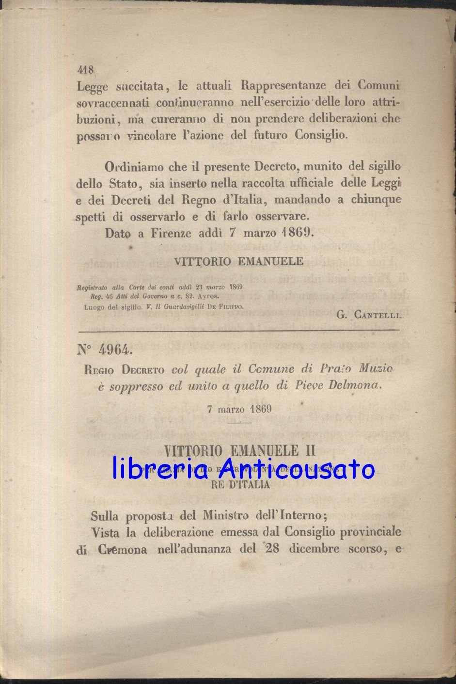 PRATO MUZIO SOPPRESSO E AGGREGATO A PIEVE DELMONA REGIO DECRETO 1869 Antico