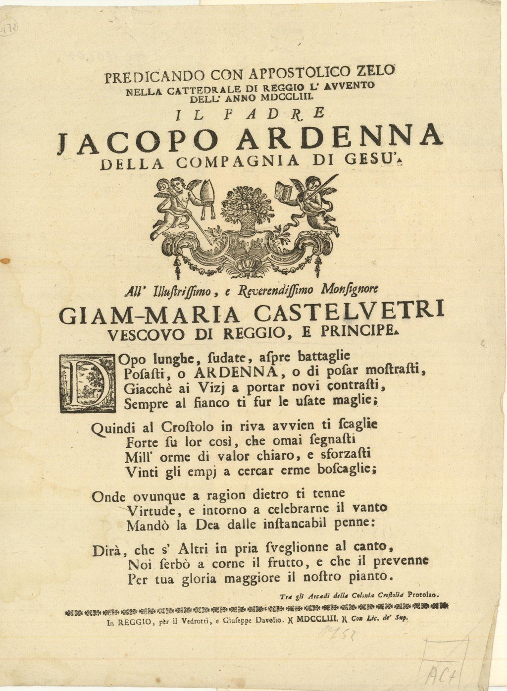 Predicando con appostolico zelo nella cattedrale di Reggio l’avvento dell’anno MDCCLIII il padre Jacopo Ardenna della Compagnia di Gesù