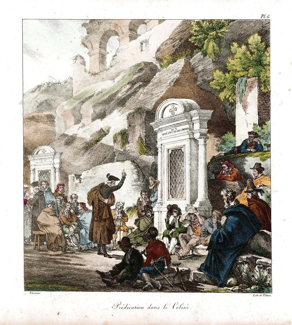 Litografia in coloritura coeva rappresentante un sacerdote predicatore di fronte ad alcune edicole al Colosseo rimosse dopo il 1870