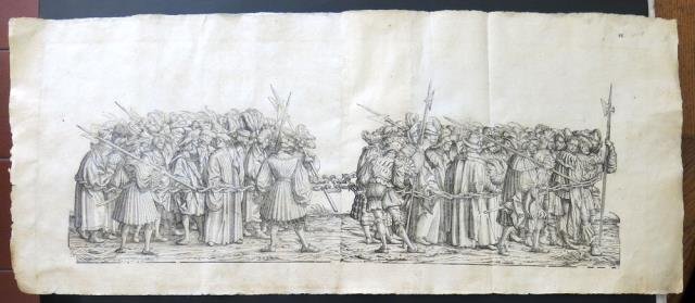 Tratta dal “Trionfo di Massimiliano I” xilografia, b/n, cm 34 x 83,5 circa (alla lastra), cm 39 x 92,5 circa (il foglio), stampata su carta finissima composta da due fogli uniti, filigrana entro cerchio visibile al verso del foglio destro. Disegnata da Hans Burgkmair (vediamo il monogramma “H B” nell’inciso, nel grande anello centrale di giunzione della catena che incatena i due gruppi; incisa da Willem Liefrinck (del cui nome non compare indicazione); in alto sul foglio di destra, è stampato il numero 95 (numero di pagina, numero del legno o numero di tavola?); abbiamo lasciato una recente segnatura a lapis con il numero 112 che potrebbe indicare il numero della tavola ma, da riferimento bibliografico consultato sul sito di “Furlanetto Stampe Antiche”, il foglio sulla destra corrisponderebbero alla tavola 109 e quello sulla sinistra alla tavola 110 (nel dettaglio i disegni di Hans Burgkmair risultano quelli dalla prima alla tavola 56, ossia ai legni 109 – 112 / 122 – 124 / 132 – 134). Il tipo di carta ci riconduce a una delle due edizioni settecentesche, quelle del 1777 e del 1796, quest’ultima curata da Adam Bartsch. Foglio lievemente e uniformemente ingiallito, più stanca la morsura del foglio sinistro, discreto lo stato di conservazione. Le xilografie della serie “Trionfo di Massimiliano I”, opera curata da Hans Burgkmair, sono da annoverare tra i grandi capolavori del cinquecento tedesco, sia per la loro qualità che per il lavoro corale e le dimensioni che, raggruppate, raggiunsero. Questa incisione appartiene a un gruppo che comprende incisioni diverse: i prigionieri; un corteo di uomini con statue e palme; musici imperiali; un folto gruppo di araldi. I disegni preparatori furono elaborati in parte da Hans Burgkmair e in parte da Leonard Beck, pittore di corte di Massimiliano I. Gli incisori delle xilografie furono scelti tra i migliori artigiani di Augusta in Baviera. Di essi in parte conosciamo i nomi, in quanto li si vollero inscritti per esteso nel retro delle tavole in pero intagliate, accanto alla data di consegna, che fu grossomodo dal novembre 1516 ai primi giorni del 1519. Per quanto solitamente questi artigiani godessero di buona stima e di buona retribuzione, sono rimasti molti i nomi difficilmente identificabili, specie quelli indicati attraverso i monogrammi. Adam Bartsch, custode delle stampe della Regia Biblioteca e curatore della fondamentale edizione del 1796, ha lasciato un lungo elenco di nomi e di monogrammi; quest’ultimi in alcuni casi sono stati associati, altre volte non è stato possibile associarli ad alcun nome certo. Tra questi Jost Nekkher (o Josse de Negkher), di cui si specifica essere incisore in legno ad Augusta, diresse e supervisionò il cospicuo gruppo di incisori che collaborò alla realizzazione dell’opera. Più facile risalire agli autori dei disegni, spesso identificati attraverso i loro monogrammi inseriti direttamente nell'inciso, come appunto è il caso di Hans Burgkmair. Hans Burgkmair, a cui comunemente si attribuisce l’opera, risulta l'autore del corpus più cospicuo dei disegni, con circa 66 disegni preparatori; circa 37 sono di Albrecht Altdorfer, 22 di Hans Springinkleene, 7 di Leonhard Beck, 2 di Hans Schäufelein. Albrecht Dürer sarebbe l'autore del disegno relativo al “Carro dell'Imperatore e della sposa Maria di Borgogna, tirato da cavalli guidati da una Vittoria alata” (di queste due tavole, dopo la stampa del 1777, ne rimase solo una, la parte con la Vittoria alata). Ad oggi si conta un totale di 135 legni xilografici sui 137 originari, essendone andato perso un secondo oltre a quello di Dürer, quello dei “Carri delle vettovaglie”. .