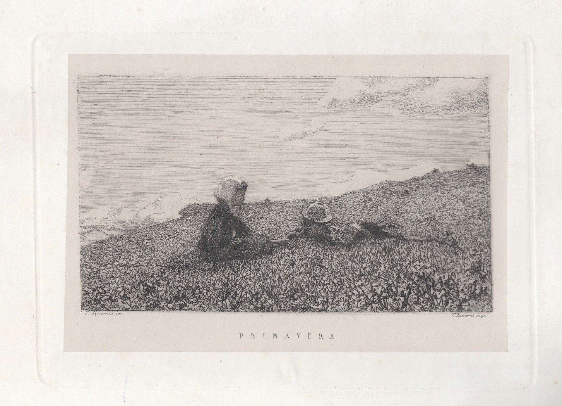 Il soggetto di quest'acquaforte deriva nello stesso verso e senza sostanziali variazioni da un dipinto a olio su tela, databile al 1870 circa (cm 39,5 x 50, collezione privata; cfr. Telemaco Signorini e la pittura in Europa, Marsilio, Venezia 2009, p. 146, n. 65, p. 146, n. 65). Esemplare stampato su carta cina color avorio applicata a carta bianca compatta. Nell'inciso sotto il soggetto: T. Signorini inc, Primavera, C. Lovera imp. Carlo Lovera è stato lo stampatore ed editore piemontese protagonista della rinascita dell'acquaforte originale in Italia nella seconda metà del XIX secolo, nonché editore della rivista Torinese L'Arte in Italia per la quale lavorarono i migliori artisti incisori del periodo.