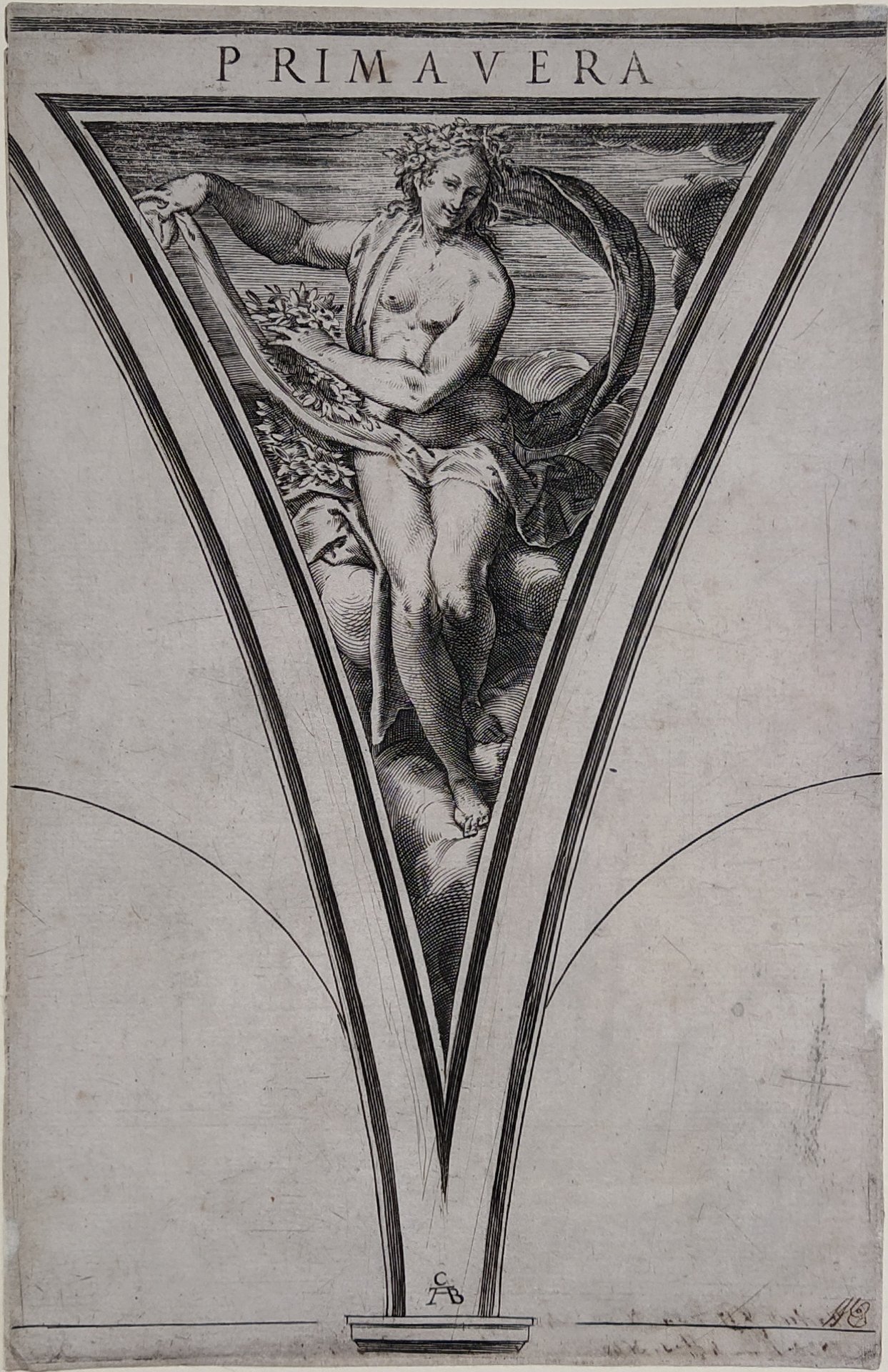 In questa stampa, tratta dalla serie Le quattro stagioni da un invenzione di Polidoro da Caravaggio, l'artista realizza all'interno di una nicchia architettonica, l'allegoria della Primavera. Viene rappresentata come una donna nuda, leggermente coperta da un drappo morbido e fluttuante. Il suo capo è abbellito da ghirlande e ha gli occhi fissi e ammiccanti verso lo spettatore. Nella mano sinistra regge copiose ghirlande e attraverso l'abile uso della tecnica, sembra scendere ed uscire da questa struttura architettonica appoggiandosi alle nubi, gonfie e riccamente contrastate. In alto al centro è iscritto in titolo e in basso il monogramma. Monogrammata anche a penna, in basso a sinistra.