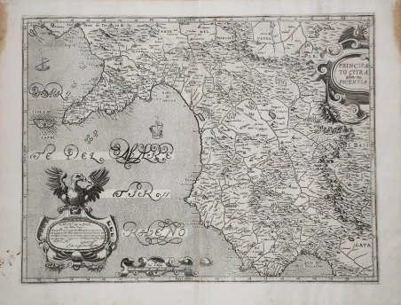 Carta geografica tratta dal ' L’Italia ' a cura di Fabio Magini, edito a Bologna nel 1620, tre anni dopo la prematura morte del padre. Composto da un breve testo descrittivo di sole 24 carte, l’opera è corredata di 61 carte geografiche della penisola, e costituisce il primo esempio di atlante italiano. L’opera è per intero di mano del Magini, che iniziò la realizzazione delle carte nel 1594 circa, dando alla luce per prima nel 1595 la carta del territorio di Bologna. Tutte le carte vennero alle stampe quindi prima del 1620, nelle loro stesure provvisorie, successivamente corrette ed aggiornate per l’edizione definitiva. Per la realizzazione delle lastre il Magini si servì di due dei più famosi intagliatori dell’epoca: il belga Arnoldo Arnoldi e l’inglese Benjamin Wright. Il Magini, per le carte del Regno di Napoli, si ispirò al rilievo ufficiale eseguito dallo studioso nolano Niccolò Antonio Stigliola il collaborazione con il cartografo viterbese Mario Cartaro, che tra il 1583 ed il 1594 ebbero l’incarico di realizzare una grande carta del reame. Incisa da Benjamin Wright. ' Nel cartiglio in alto a destra il titolo PRINCIPATO CITRA olim PICENTIA. In basso a destra il cartiglio con la dedica All’ Ill.mo Sig.r mio P[at]ron[us] Col.mo il Sig.r Massimo Caprara. Havendo V.S. non poco gusto delle Mathematiche, et in particolare della Geografia, ho voluto dedicarle questa tavola, che servirà per testimonio delli molti oblighi, ch’io le tengo, per havermi sempre favorito, con tanta prontezza, ne i miei maggior bisogni. E le bacio le mani. Di Bologna il di p.o Nove[m]bre 1606. Di V. S. Ill.ma ' Serv.re Aff.mo Fabio di Gio. Antonio Maginij Pad.o e la scala grafica Scal di Miglia (15 miglia pari a mm 76). Orientazione nei quattro lati al centro con il nome dei punti cardinali Septentrio, Meridies, Oriens, Occidens, il nord in alto. Graduazione ai margini di 1’ in 1’ da 40° 30’’ a 41° 1’ di latitudine, e da 37° 21’ a 39° 7’ di longitudine. ' Esemplare nel secondo stato, con la dedica firmata da Fabio Magini, sempre a Massimo Caprara e sempre con data 1606, al luogo di quella a firma Giovanni Antonio Magini. ' Lieve gora nei margini, nel complesso in ottimo stato di conservazione. Map taken from ' L'Italia ' edited by Fabio Magini, published in Bologna in 1620, three years after the untimely death of his father. Composed of a short descriptive text of only 24 pages, the work is accompanied by 61 maps of the peninsula, and is the first example of an Italian atlas. The work is entirely by the hand of Giovanni Antonio Magini, who began the realization of the maps in 1594 or so; the first dated map (1595) the map of the territory of Bologna. All the maps were printed before 1620, in their provisional drafts, later corrected and updated for the final edition. For the realization of the plates Magini used two of the most famous engravers of the time: the Belgian Arnoldo Arnoldi and the English Benjamin Wright. Copperplate, in good condition. La carta deriva da quella contenuta in "atlantino napoletano" opera di Nicola Stigliola e Mario Cartaro. Nel cartiglio in alto a destra il titolo ' PRINCIPATO CITRA olim PICENTIA. ' In basso a destra il cartiglio con la dedica ' All’ Ill.mo ' Sig.r ' mio P[at]ron[us] Col.mo ' il Sig.r ' Massimo Caprara. Havendo V.S. non poco gusto delle Mathematiche, et in particolare della Geografia, ho voluto dedicarle questa tavola, che servirà per testimonio delli molti oblighi, ch’io le tengo, per havermi sempre favorito, con tanta prontezza, ne i miei maggior bisogni. E le bacio le mani. Di Bologna il di p.o ' Nove[m]bre 1606. Di V. S. Ill.ma ' ' Serv.re ' Aff.mo ' Fabio di Gio. Antonio Maginij Pad.o ' e la scala grafica ' Scal di Miglia ' (15 miglia pari a mm 76). ' Orientazione nei quattro lati al centro con il nome dei punti cardinali ' Septentrio, Meridies, Oriens, Occidens, ' il nord in alto. Graduazione ai margini di 1’ in 1’ da 40° 30’’ a 41° 1’ di latitudine, e da 37° 21’ a 39° 7’ di longitudine. ' Esemplare nel secondo stato, con la dedica firmata da Fabio Magini, sempre a Massimo Caprara e sempre con data 1606, al luogo di quella a firma Giovanni Antonio Magini. ' Lieve gora nei margini, nel complesso in ottimo stato di conservazione. Cfr. Almagià (1922) pp. 74/76.