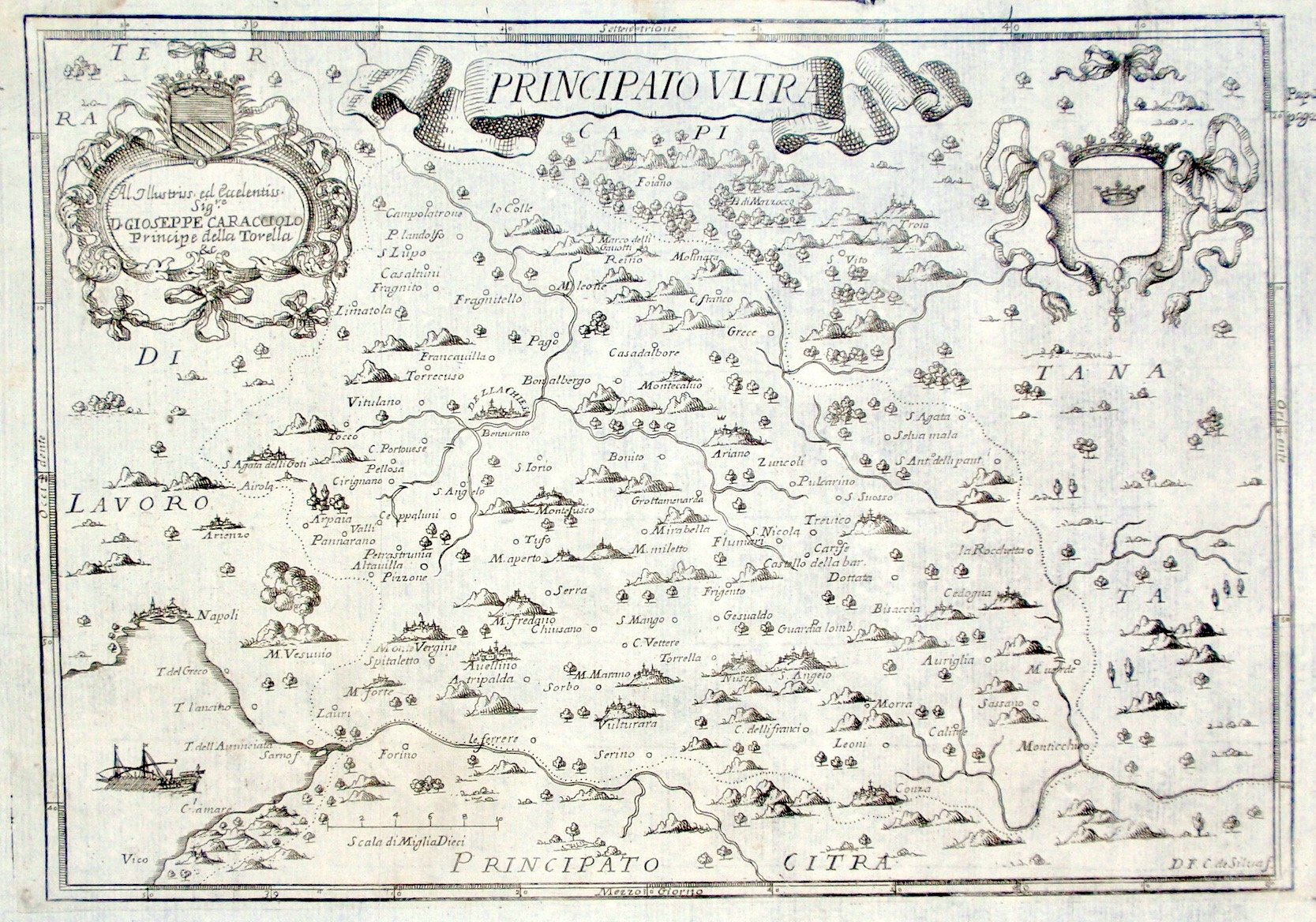 Incisione in rame di mm 200x290 raffigurante parte del territorio campano. Due bei cartigli decorati con dedica e stemma fiancheggiano in alto un nastro recante il titolo. Tratta da " Il Regno di Napoli in prospettiva". Bell'esemplare con restauro a minima menda presso il titolo. <BR>