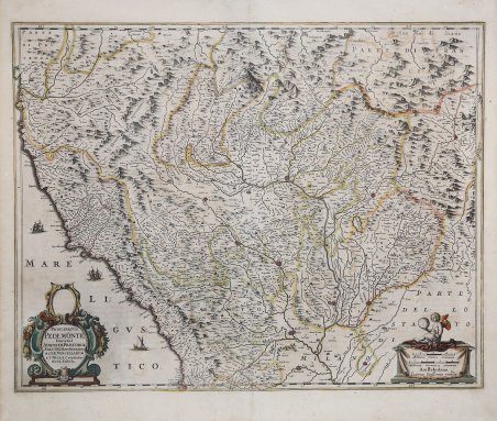 Carta geografica tratta da "Atlas Novus sive Theatrum Orbis Terrarum", edizione latina del 1647. Questa edizione del Atlas Novus del Janssonius contiene per la prima volta le carte della penisola con nuovi, più decorativi, cartigli. Joannes Janssonius, figlio dell'editore di Arnhem Jan Janssen, sposò Elisabeth Hondius, figlia di Jodocus Hondius, ad Amsterdam nel 1612. Dopo il suo matrimonio, si stabilì in questa città come libraio ed editore di materiale cartografico. Nel 1618 si stabilì ad Amsterdam accanto alla libreria di Willem Jansz. Blaeu, entrando in una seria competizione. Le sue attività non riguardavano solo la pubblicazione di atlanti e libri, ma anche di mappe singole e un vasto commercio di libri con filiali a Francoforte, Danzica, Stoccolma, Copenaghen, Berlino, Koningsbergen, Ginevra e Lione. Nel 1631 iniziò a pubblicare atlanti insieme a Henricus Hondius. Nei primi anni 1640 Henricus Hondius lasciò l'attività di pubblicazione di atlanti completamente a Janssonius. La concorrenza con Joan Blaeu, figlio e successore di Willem, nella produzione di atlanti spinse Janssonius ad ampliare il suo Atlas Novus finalmente in un'opera di sei volumi, in cui furono inseriti un atlante marino e un atlante del Vecchio Mondo. Dopo la morte di Joannes Janssonius, il negozio e la casa editrice furono continuati dagli eredi sotto la direzione di Johannes van Waesbergen (c. 1616-1681), genero di Joannes Janssonius. Le matrici degli atlanti di Janssonius furono in seguito vendute a Schenk e Valck. Incisione in rame, coloritura coeva, in buono stato di conservazione. Joannes Janssonius (Arnhem, 1588-1664), son of the Arnhem publisher Jan Janssen, married Elisabeth Hondius, daughter of Jodocus Hondius, in Amsterdam in 1612. After his marriage, he settled down in this town as a bookseller and publisher of cartographic material. In 1618 he established himself in Amsterdam next door to Blaeu’s book shop. He entered into serious competition with Willem Jansz. Blaeu. His activities not only concerned the publication of atlases and books, but also of single maps and an extensive book trade with branches in Frankfurt, Danzig, Stockholm, Copenhagen, Berlin, Koningsbergen, Geneva, and Lyon. In 1631 he began publishing atlases together with Henricus Hondius. In the early 1640s Henricus Hondius left the atlas publishing business completely to Janssonius. Competition with Joan Blaeu, Willem’s son and successor, in atlas production prompted Janssonius to enlarge his Atlas Novus finally into a work of six volumes, into which a sea atlas and an atlas of the Old World were inserted. After the death of Joannes Janssonius, the shop and publishing firm were continued by the heirs under the direction of Johannes van Waesbergen (c. 1616-1681), son-in-law of Joannes Janssonius. The copperplates from Janssonius’s atlases were afterwards sold to Schenk and Valck. Cfr. Koeman me 59, p. 409, 33.