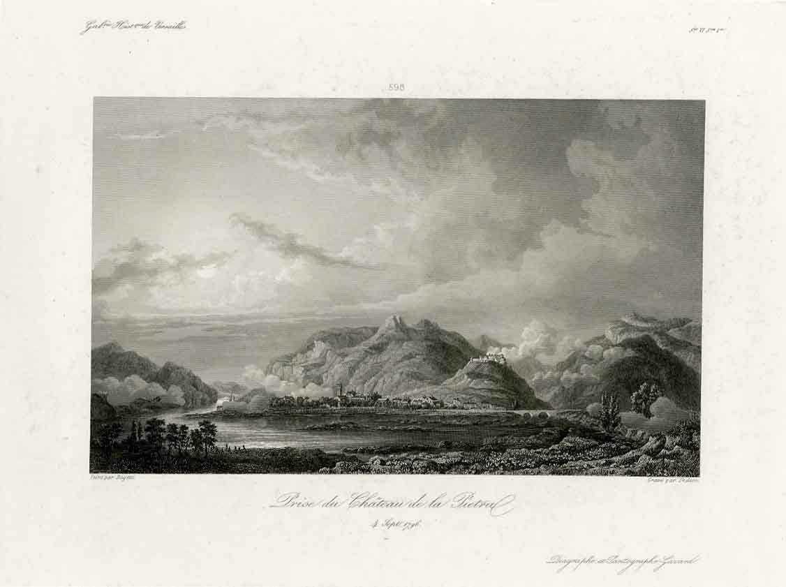 Incisione in acciaio di dimensioni 144x232 mm. Condizioni : USATO - Stato : Buono, ordinari segni d'uso e del tempo. Altre note : Il paesaggio attorno a Castel Pietra, con l'Adige in primo piano, è protagonista in questa veduta che rappresenta la battaglia di Calliano, combattuta tra francesi ed austriaci nel settembre del 1796 e qui minimamente accennata. L'autore, il pittore e architetto torinese Giuseppe Piero Bagetti, seguì l'esercito francese sul campo documentando visivamente la prima campagna di Napoleone in Italia. Pare che per realizzare le vedute studiasse le carte topografiche della zona e interrogasse i protagonisti della vicenda.