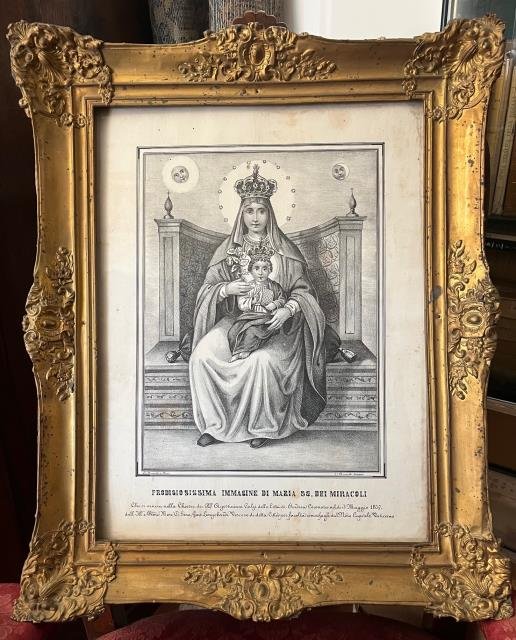 Litografia del 1830 circa, b/n, cm 33 x 43 (al foglio). Nominata in basso a sinistra "Lit. Brunetti a Basi" e in basso a destra "S. Brunetti disegnò". Bella e rara litografia italiana di estrazione popolare in cui è raffigurata la Vergine che si venera nella Città di Andria: siede la Vergine col Bambino, coronata e cinta da un'aurea di piccole stelle; il bambino è mostrato già in atto pantocratore, nell'altra mano tiene il Vangelo; assistono e guardano la scena il Sole e la Luna con volti ridenti. Andria è capoluogo, insieme a Barletta e Trani, della provincia di Barletta – Andria - Trani, in Puglia (fino al 2004 ha fatto parte della provincia di Bari). Con coeva cornice in legno e originale vetro in bolla. Buono stato di conservazione.